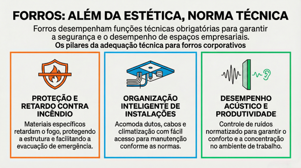Os forros exercem funções essenciais para adequação técnica dos ambientes empresariais.
